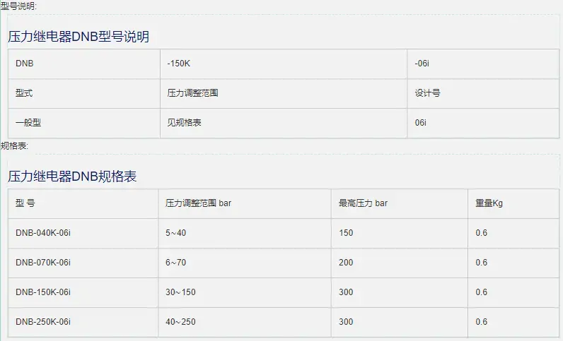 壓力繼電器DNB有如下型號:DNB-040K-06i,DNB-070K-06i,DNB-150K-06i,DNB-250K-06i。