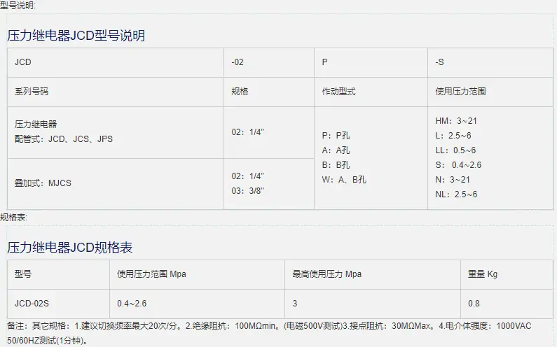 壓力繼電器JCD有如下型號:JCD-02S。