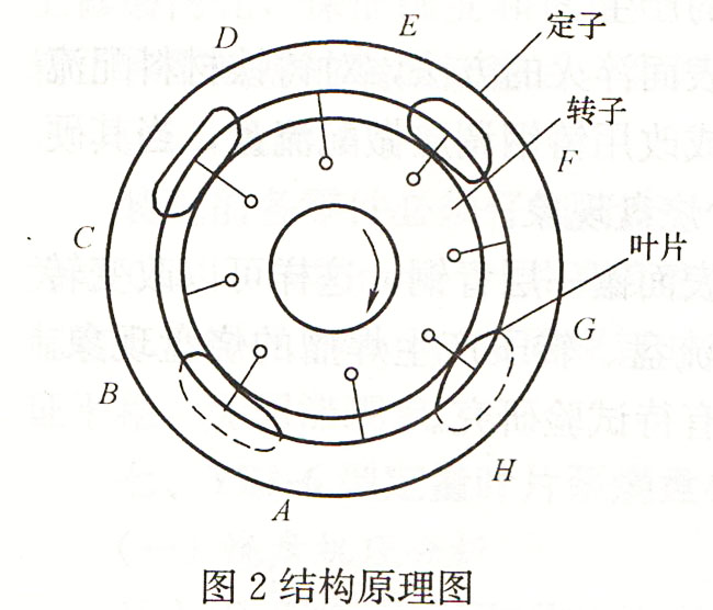 將損壞的液壓泵進行解剖,發現定子曲線內表面嚴重磨損(見圖2)。定子由合金鋼制成,其內表面由四段圓弧及四段過渡曲線組成,滑道曲面經硬化處理(滲碳或氮化)并磨光,以承受葉片端部的滑磨及接觸應力。葉片由熱處理后具有高硬度的鋼材制成,其與滑道接觸的一端通常制成光滑的圓角。解剖發現排油區AB、EF兩段弧磨損最為嚴重,已磨出溝槽,葉片前端(與定子接觸端)有摩擦亮痕。