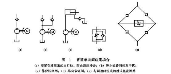 (5)應用在其他地方。一些需要控制液流方向單向流動的場合可采用多個普通單向閥來實現。如單向閥群組的半橋和全橋與其他閥組成的回路。如圖1(e)所示。