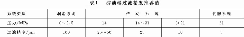 過濾精度選用的原則是:使所過濾污物顆粒的尺寸小于液壓元件密封間隙尺寸的一半。系統壓力越高,液壓件內相對運動零件的配合間隙越小,因此,需要的濾油器過濾精度也就越高。液壓系統的過濾精度主要取決于系統的壓力。表1為過濾精度選擇推薦值。