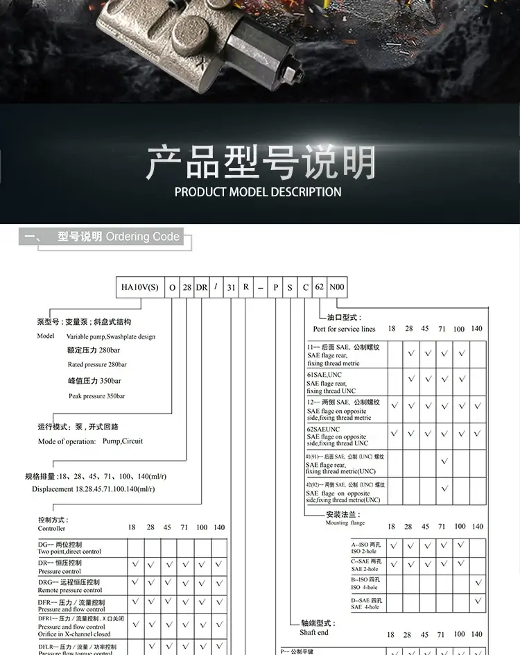 16mL/r 高壓變量柱塞泵,恒壓控制、法蘭安裝、右旋、標準 01 基礎配置。